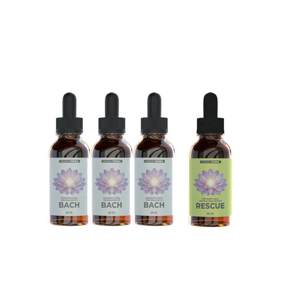 Incluye 3 frascos de preparado personalizado + 1 frasco de Rescue Remedy para momentos puntuales.